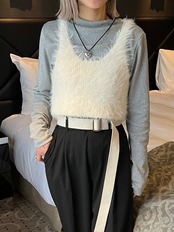 今年らしいフェザーヤーンを使用したニットビスチェ。
