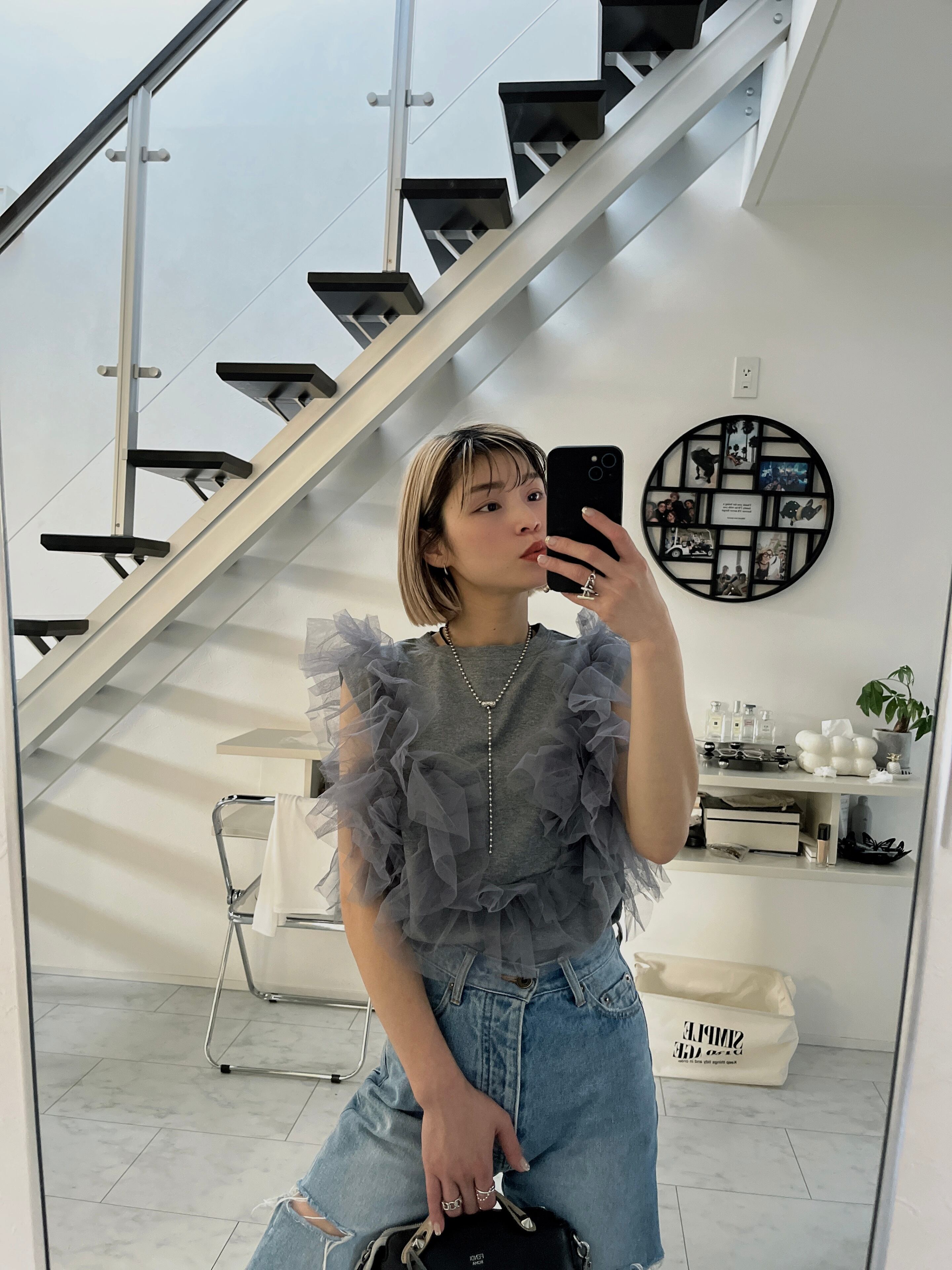 着心地の良いシンプルなノースリーブトップスに、 チュールビスチェをレイヤードしたかのような、
